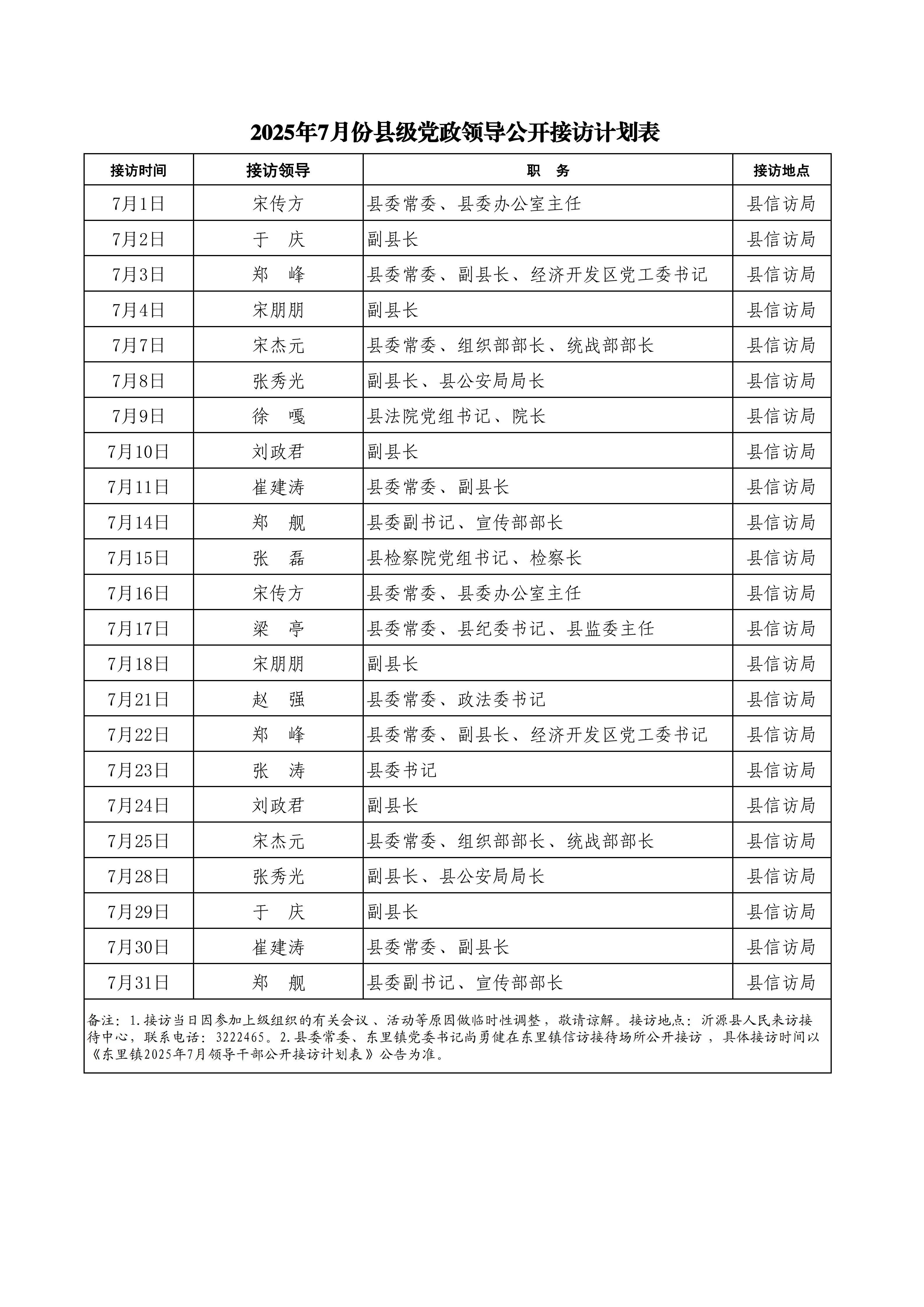 2025年7月份县级党政领导公开接访计划表