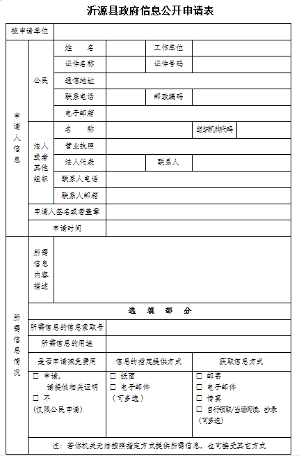 1、书面提交申请。向本机关申请获取政府信息,应当书面填写《沂源县政府信息公开申请表》(以下简称《申请表》)。《申请表》可以从县政府网站下载、打印,复制有效。