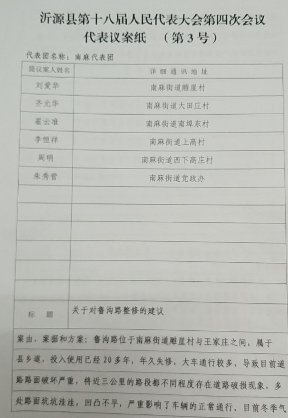建议人: 刘爱华、齐元华、崔云准、李恒祥、周 明、朱秀营