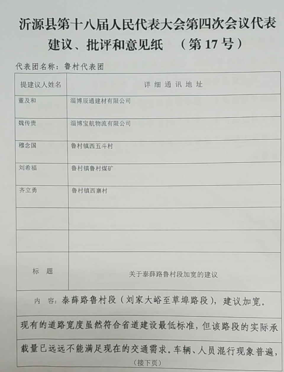 您提出的关于泰薛路鲁村段加宽的建议收悉。现答复如下: