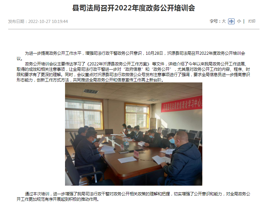今年以来,县司法局将政府信息公开与司法行政工作有机融合,相互促进,及时调整更新政务公开领导小组、机构设置及分管负责人,明确局法制科为政务公开责任科室,负责推进、指导、协调、监督沂源县司法局信息公开和政务公开工作,承办沂源县司法局政府信息主动公开工作,受理向沂源县司法局提出的政府信息公开申请。明确局普法与依法治理科负责局公众号信息的更新和维护,由全局各科室处所按照职能分工提供相关素材。县司法局始终将政务公开工作作为重点工作纳入到局绩效目标考核任务,今年共开展“政府开放日”活动2次,组织政务公开业务培训2次,切实提升了我局政务公开工作人员的能力素质,增强了工作透明度。