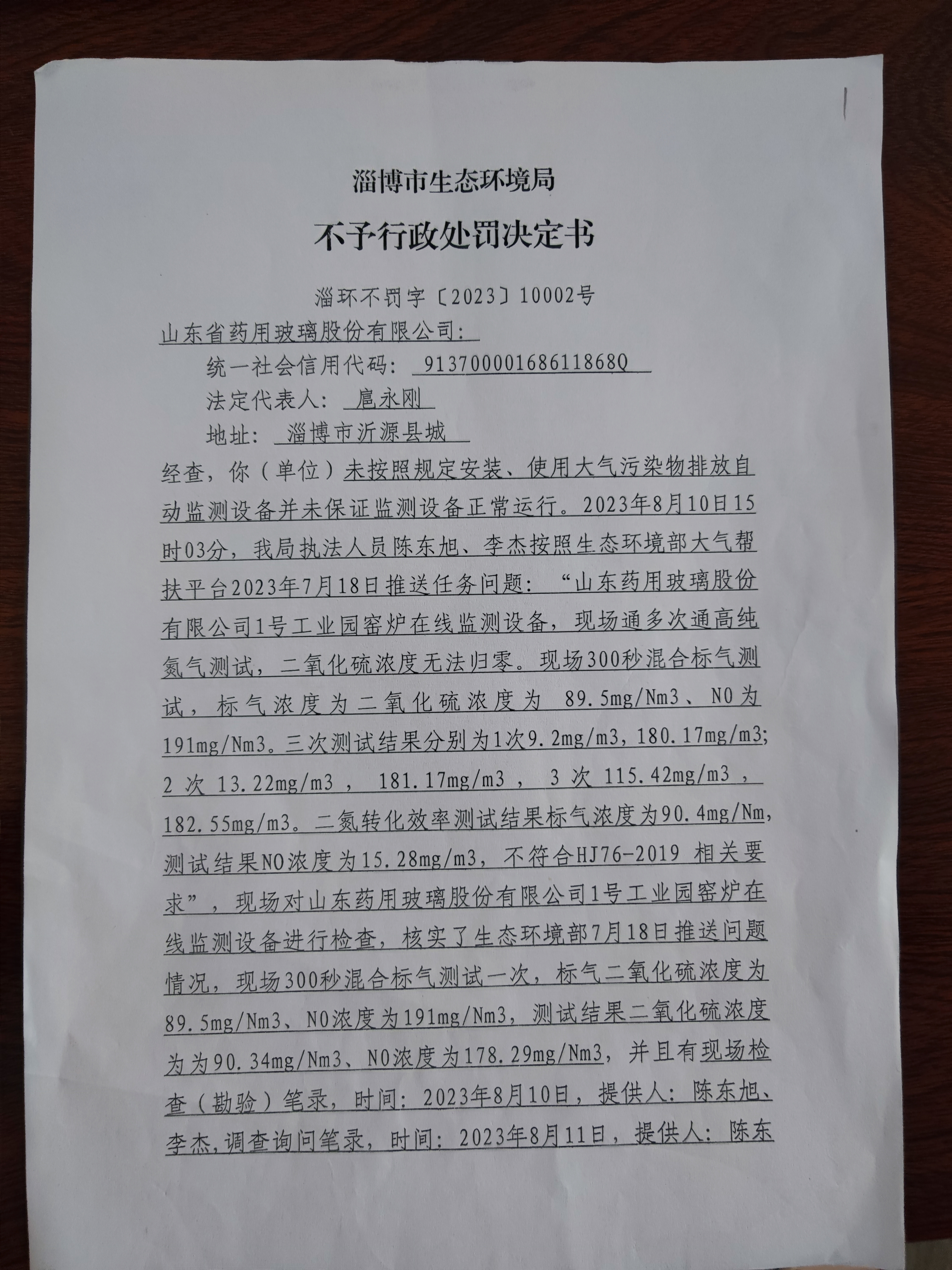 山东省药用玻璃股份有限公司未按照规定安装、使用大气污染物排放自动检测设备并未保证监测设备正常运行