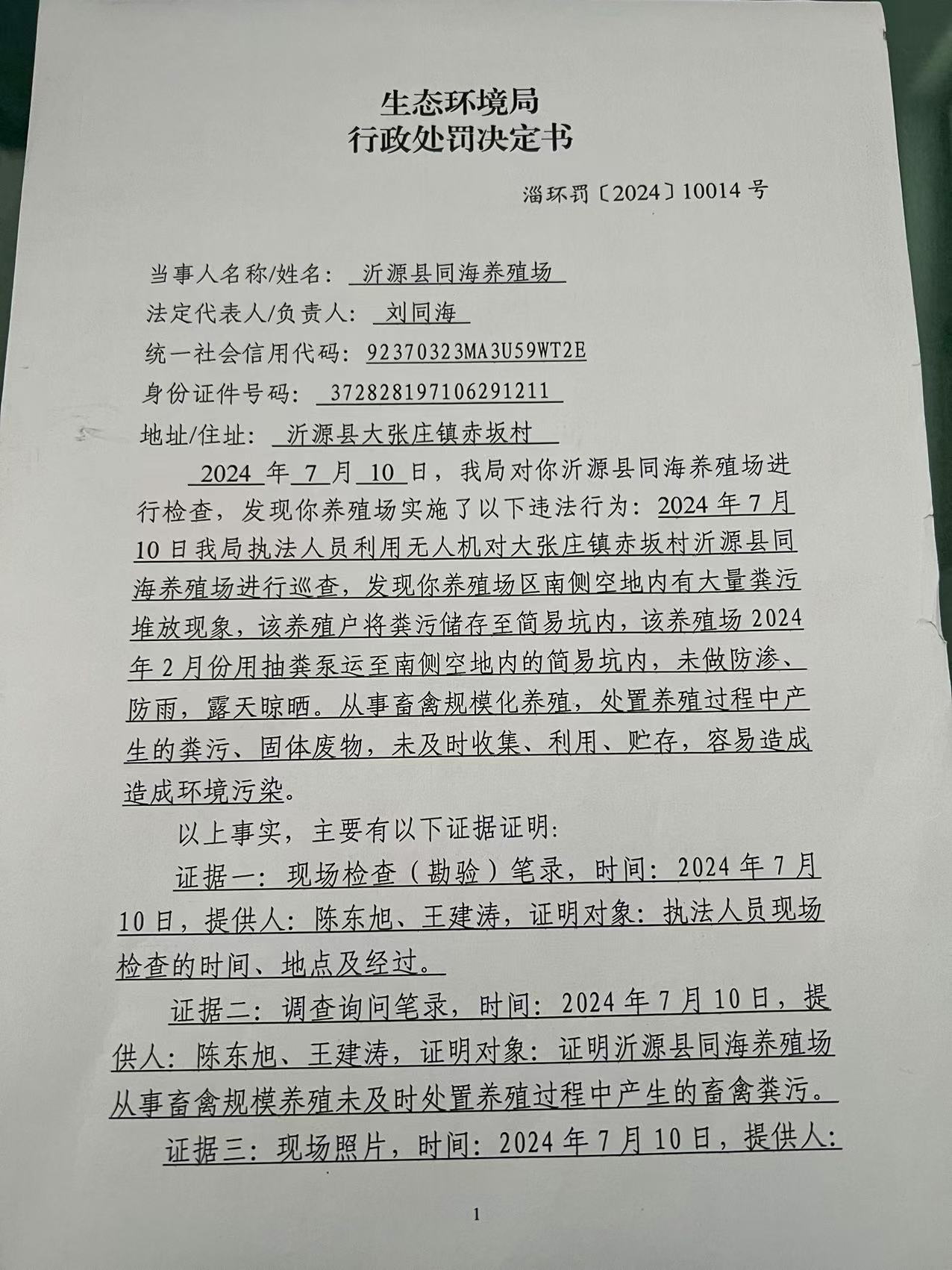 沂源县同海养殖场从事畜禽规模养殖未及时处置养殖过程中产生的畜禽粪污等固体废物