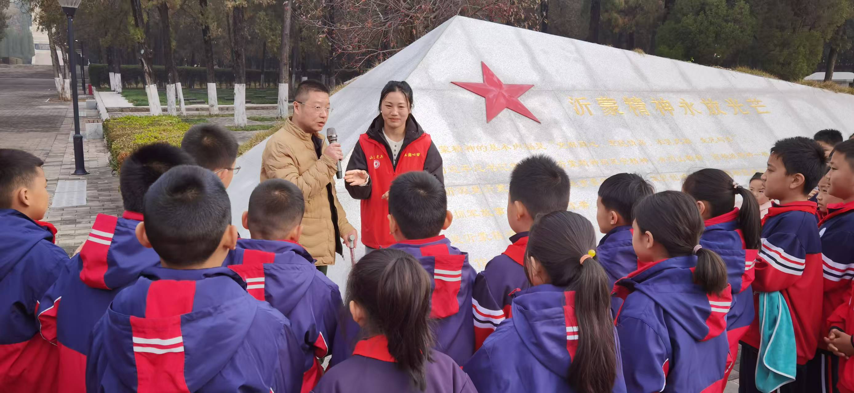 活动中,由退役军人、兵妈妈、军嫂等群体组建起的一支103人的“红润心田”志愿服务队,常态化提供秩序维护、引导讲解等六类志愿服务,增强了教育活动的亲和力与实效性。在活动中,由志愿者们为师生讲述无名烈士墓的革命事迹,在沂蒙精神纪念墙前讲述沂蒙精神的丰富内涵和烈士故事,一众师生均表示很受鼓舞,在革命烈士何万祥纪念碑前,全体师生更是喊出“愿以吾辈之青春 捍卫盛世之中华”的响亮口号。