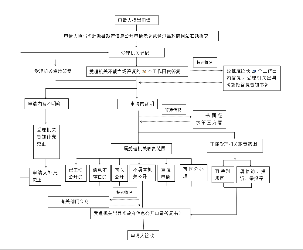 本机关办理申请人政府信息公开申请时,能够当场答复的,将当场答复;不能当场答复的,自收到申请之日起20个工作日内予以答复;确需延长答复期限的,延长答复时间不超过20个工作日,并告知申请人。政府信息涉及第三方权益的,应当征求第三方的意见,征求第三方意见所需时间不计算在期限内。