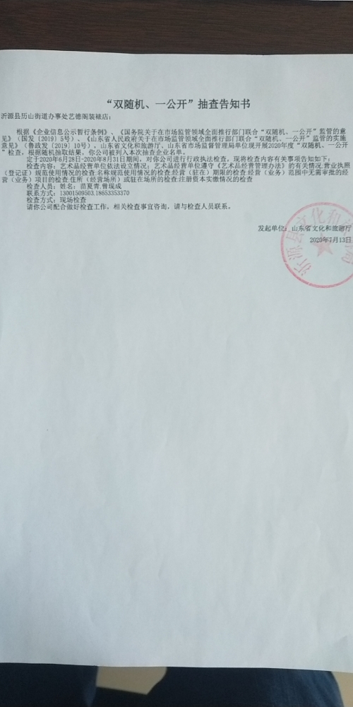 沂源县文化和旅游局2020年11月份“双随机、一公开”抽查结果信息