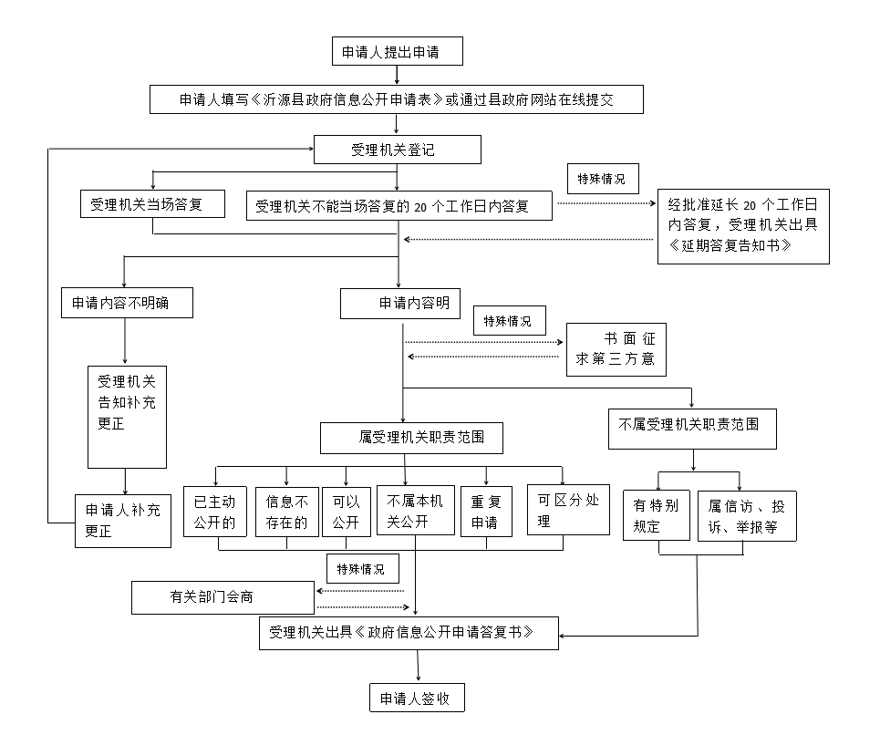 本机关办理申请人政府信息公开申请时,能够当场答复的,将当场答复;不能当场答复的,自收到申请之日起20个工作日内予以答复;确需延长答复期限的,延长答复时间不超过20个工作日,并告知申请人。政府信息涉及第三方权益的,应当征求第三方的意见,征求第三方意见所需时间不计算在期限内。