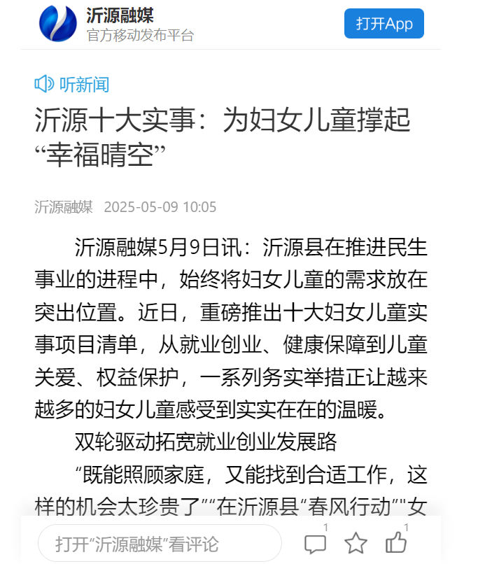 沂源融媒5月9日讯沂源县在推进民生事业的进程中,始终将妇女儿童的需求放在突出位置。近日,重磅推出十大妇女儿童实事项目清单,从就业创业、健康保障到儿童关爱、权益保护,一系列务实举措正让越来越多的妇女儿童感受到实实在在的温暖。
