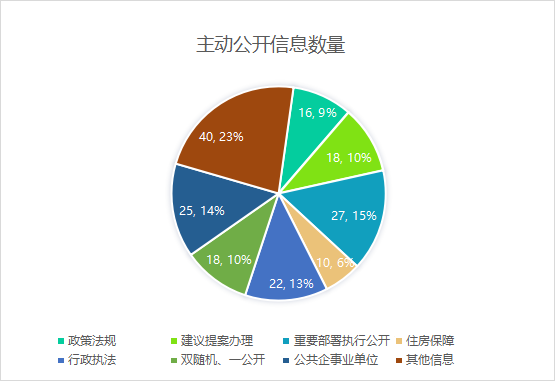 依据《中华人民共和国政府信息公开条例》第二十条关于法定主动公开情况规定,积极履行主动公开职责,2024年,在政府网站发布267条信息,其中,政策法规信息15条,公共资源配置22条,重要部署执行公开60条,行政执法信息11条,“双随机、一公开”信息23条,公共企事业单位信息75条,其他类信息61条。按照“谁起草谁解读”原则,通过领导解读、图文解读形式,高质量、全方位做好政策解读,增强政策可视化和可接受性,今年以来,共解读政策文件4篇。按季度公开经济社会发展目标任务落实情况及住房保障等相关信息,更好为民办实事、服好务、尽好责。